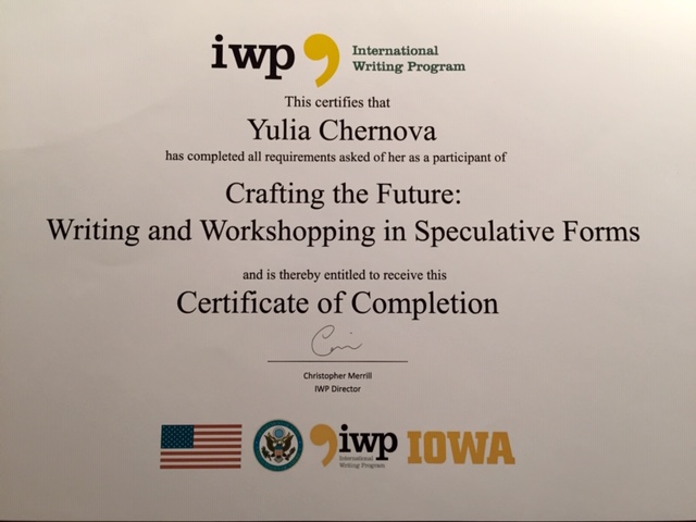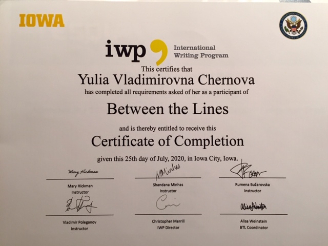 В июле 2020 года Чернова Юлия Владимировна приняла участие в программе для начинающих писателей, организованной университетом Айовы (International Writing Program, Iowa). На протяжении двух недель семинары вели писатели из Америки, Болгарии, Пакистана. 42 студента и 8 сопровождающих из Америки, России, Египта, Ирака и других стран получили уникальную возможность познакомиться с современной литературой, обсудить тенденции, а также попробовать себя в качестве писателей.