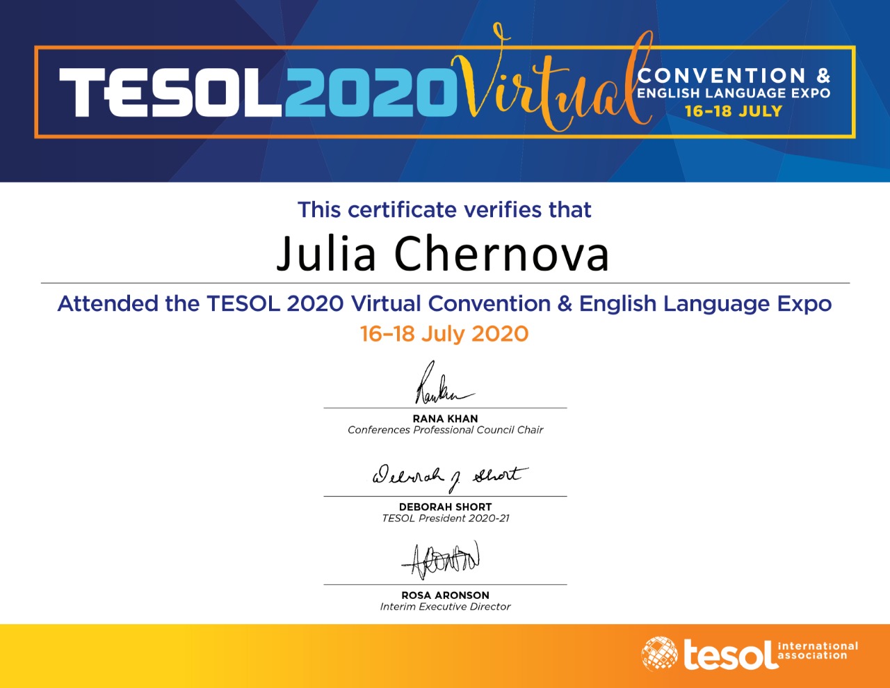 Закрытие границ открыло новые ‘виртуальные’ возможности, что позволило нам поучаствовать в крупнейшей международной конференции TESOL 2020, где своим опытом и методическими находками поделились более 100 спикеров со всего мира. На протяжении трех дней (16-18 июля) мы общались с преподавателями со всего мира, задавали вопросы и получали обратную связь. Чернова Юлия Владимировна и Чернова Мария Александровна получили сертификат участника конвенции.